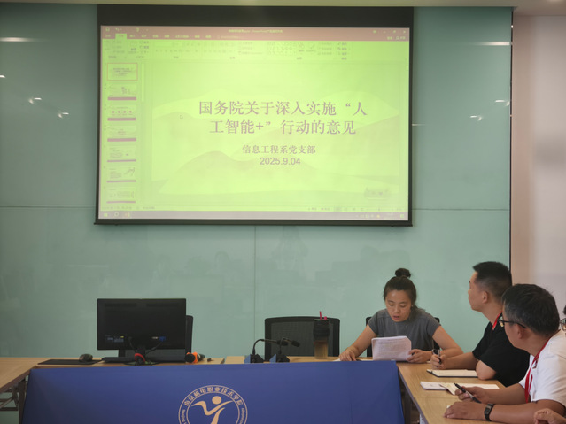 2025年9月4日下午14:00,信息工程系党支部在弘毅楼602开展了党员政治理论学习活动,此次学习聚焦于《国务院关于深入实施“人工智能 +” 行动的意见》,由系教学副主任刘娴担任主讲人。