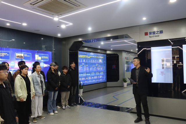 活动伊始,在中邮建集团客户部宋宜泽的引导下,师生一行先后参观了公司智慧展厅与实验室。近40分钟的参观过程中,宋宜泽详细讲解了企业核心技术、业务布局及行业应用案例,直观展现的数字化成果与前沿技术,让师生们对通信行业的实际发展场景有了更真切的认知。
