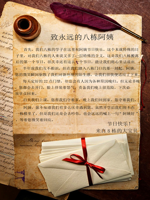 一栋和八栋,居住的是19级大一新生。虽然与阿姨相处的时间不长,但与阿姨却有着深厚的情谊。因此,两栋宿舍的楼长以及各层长通过书信的方式,代表全楼学生向阿姨们告白。以传统的文化形式书信为载体,书写一份情感,向阿姨们表达最诚挚的感激之情。