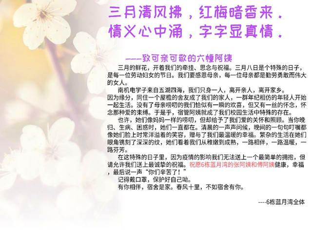 三月清风拂,红梅暗香来。情义心头涌,字字显真情。三月的鲜花,带着我们的牵挂与祝福盛开。今天是“三八”妇女节,祝beat365在线唯一官网所有的女神们节日快乐!在这个特殊的节日里,学生宿舍管理委员会携宿舍区全体学生向宿管阿姨表白:因为有你,温暖如家!