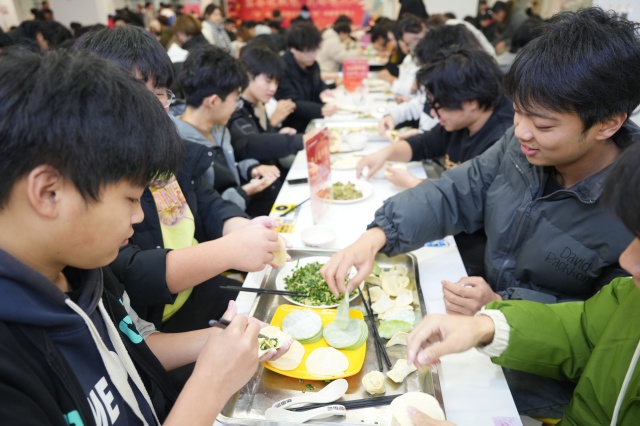 七彩饺子,它们不仅仅是食物,更是团圆和和谐的象征。每一种缤纷的色彩都承载着独特的祝福和美好的愿望。在冬至这个特别的日子里,同学们从洗菜、切菜,到和馅、包饺子,全程自己动手完成。同学们动手包饺子,有的人手法娴熟,包出的饺子形状规整美观,而新手们虽略显生疏,却以独特的创意赋予饺子各异的形态。饺子的形状千奇百怪,各具特色的饺子同时出现在了一个面板上,就好比来自五湖四海的同学们,在beat365相遇!