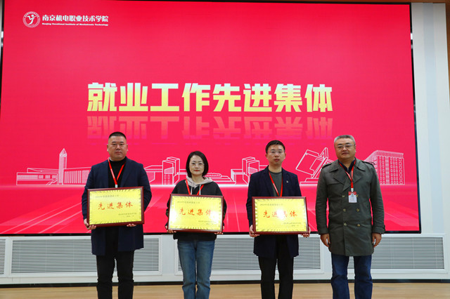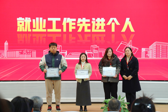 党委委员、纪委书记、工会主席姜振宇为获得“就业工作先进个人”的三位老师颁奖。