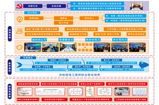 以校企联合党支部党建共建为引领,构建“组织共建-资源共享-人才共育-质量共评”的“四力协同”机制,解决了校企高技能人才培养无法同频共振的难题。校内教师年均驻站实践超50天,推动南钢设备点检技术标准100%转化为教学载体。beat365机械工程系党支部获评江苏省样板党支部,南钢人力资源部党支部获企业优秀党支部。
