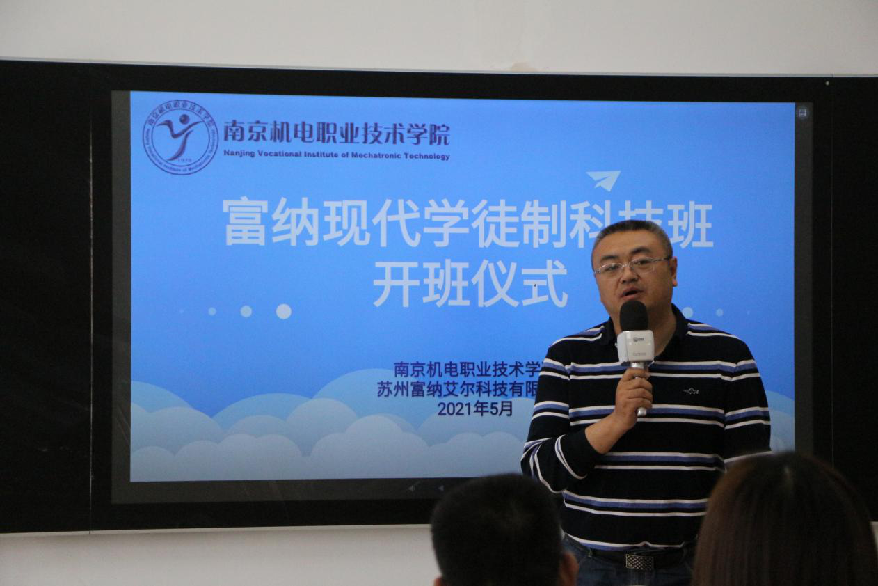 开班仪式上,刁爱军院长首先代表学校向苏州富纳艾尔科技有限公司的大力支持表示感谢,向富纳现代学徒制科技班全体同学表示祝贺。刁爱军院长详细解读了“现代学徒制”相关政策,并从“身份转变”、“学习方法转变”和“职业认知转变”三个方面对学生提出了要求,希望富纳科技班全体同学能够珍惜机会、刻苦学习,通过现代学徒制的系统培养,无论从技术水平还是岗位适配度以及收入上都能得到全面提升。