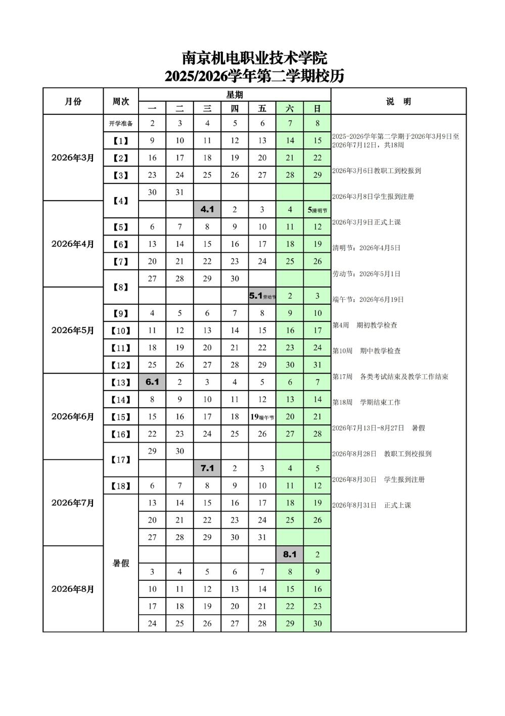 2025-2026学年第2学期校历