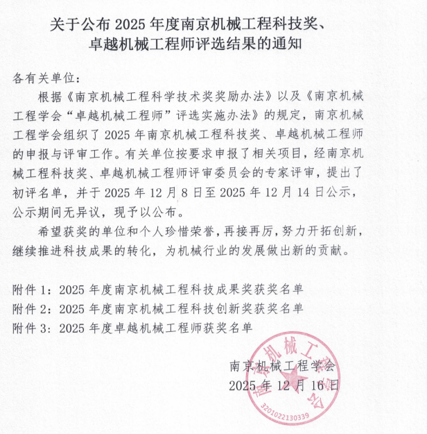 南京机械工程科技奖评选活动由南京机械工程学会组织开展,自2025年5月启动申报以来,吸引了众多会员单位、个人会员积极参与。评选严格遵循《南京机械工程科学技术奖奖励办法》相关规定,经评审委员会专家严谨评审、公示无异议后最终确定获奖名单,此次奖项的含金量与行业认可度备受瞩目。