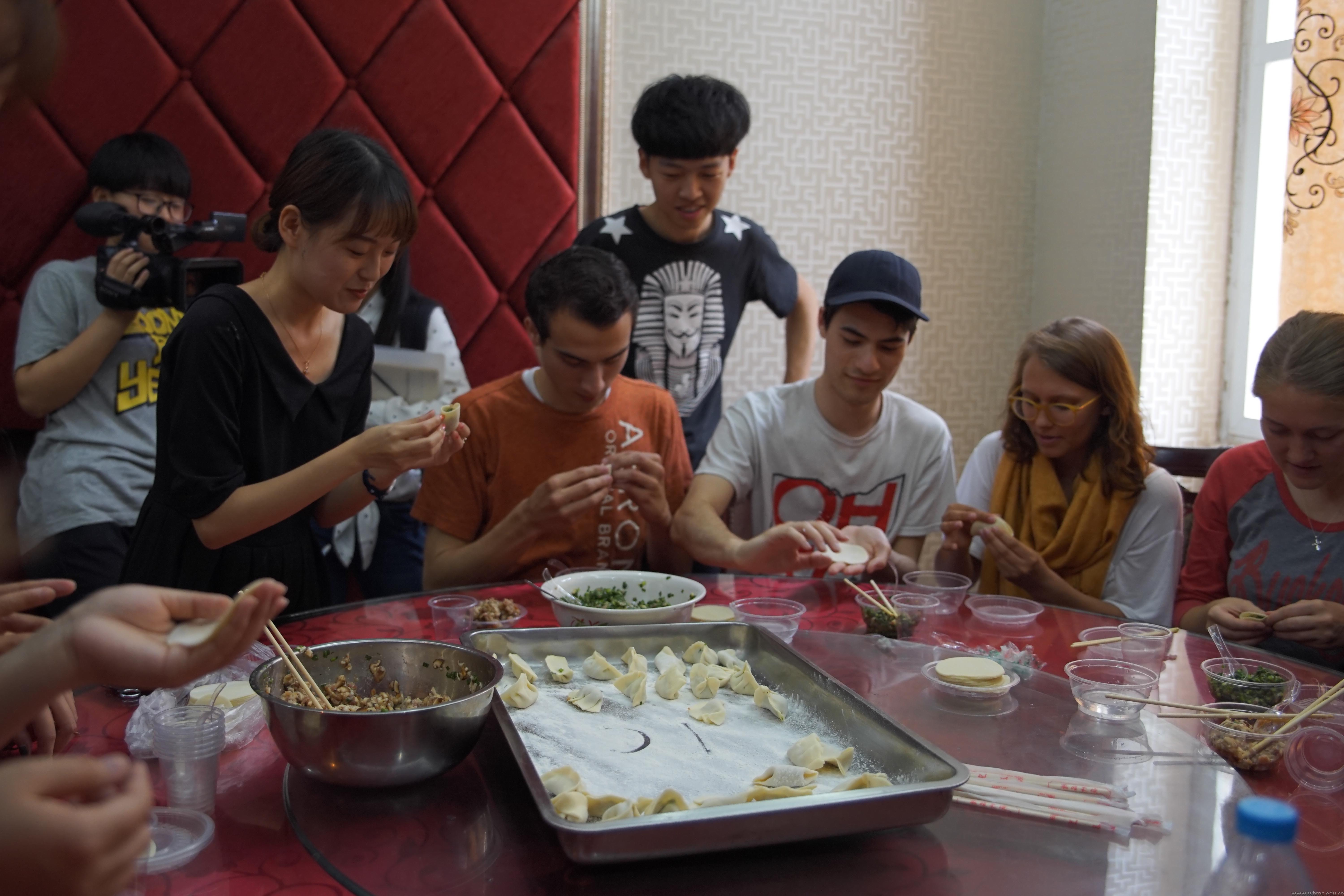 上午10点30分,在学校食堂,太阳集团学子教美国交流生包饺子。 “师傅”杨天骄一点点教“洋学生”们饺子馅的取量,捏褶子的大小和位置,“洋学生”Henry在家里经常做饭,看着“师傅”杨天骄包了两个便学会了,有模有样的饺子让“师傅”们纷纷称赞。而不走寻常路的Jacob没学会,他仿照做汉堡的样子,把饺子馅夹在两片饺子皮中。20分钟后,100多只饺子大功告成,尽管有的饺子被捏成了“包子”“汉堡包”,有的被煮得只剩下一层皮,9人仍为第一次制作的中国美食兴奋不已,将饺子吃的干干净净。在“诗词大赛”节目上,交流生回答了“著名的意大利人马可.波罗是在哪个朝代来的中国?”“中国历史上第一位的女皇帝是?”等问题。