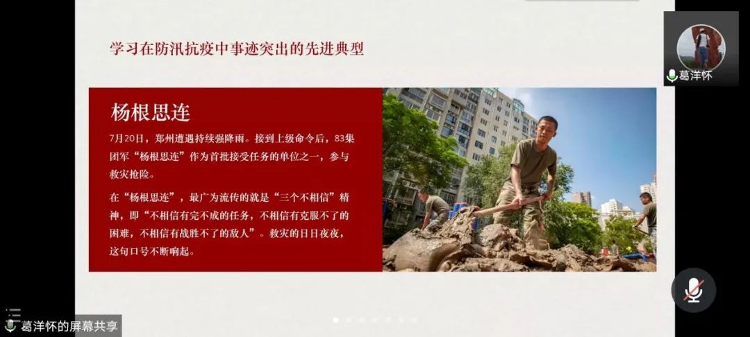 葛洋怀同志带领全体同志共同学习了在防汛抗疫中事迹突出的先进典型。包括“不相信有完不成的任务,不相信有克服不了的困难,不相信有战胜不了的敌人”,“三个不相信”精神的杨根思连;英勇奋战在防汛一线的郑州市郑东新区金光路党工委副书记、街道办主任中共党员任冀军和金光路街道办事处党政主任“拼命三郎”“工作狂”翟向以及巩义市米北村第13村民组组长马新喜等等;在抗疫一线奔波的张家界市公安局交警支队一大队民警杜汉明,还包括就发生在我们身边的,崇阳县石西庄村党支部书记代低归背着独居老人打疫苗的感人场景。